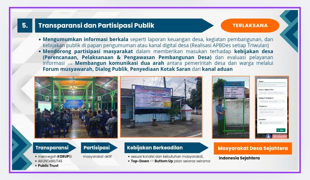 Lebih lanjut, beliau menegaskan bahwa transparansi merupakan kunci dalam mencegah korupsi, menumbuhkan partisipasi masyarakat dalam merumuskan kebijakan desa, serta mewujudkan kebijakan yang adil dan berkeadilan bagi seluruh lapisan masyarakat desa.